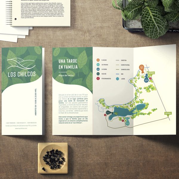 Cliente Los Chilcos Identidad y Editorial Diseño y diagramación de tríptico informativo para el sector «Los Chilcos» ubicado en La Unión con Puerto Nuevo, Lago Ranco. Esta empresa ofrece el lugar perfecto para pasar una tarde de recreación en familia, ya que cuenta con una oferta gastronómica imperdible, interesantes exposiciones, un molino hidráulico, una cafetería…
